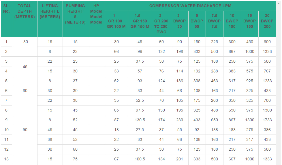 The borewell compressor pump works on the principle of difference in density of two-inter-connected water columns and the heavier one over balancing the lighter one. Water outflow through delivery pipe will be pulsated. the discharge of water will greatly depend on the yield of the bore. Air distributor fitted at the end makes this operation possible..